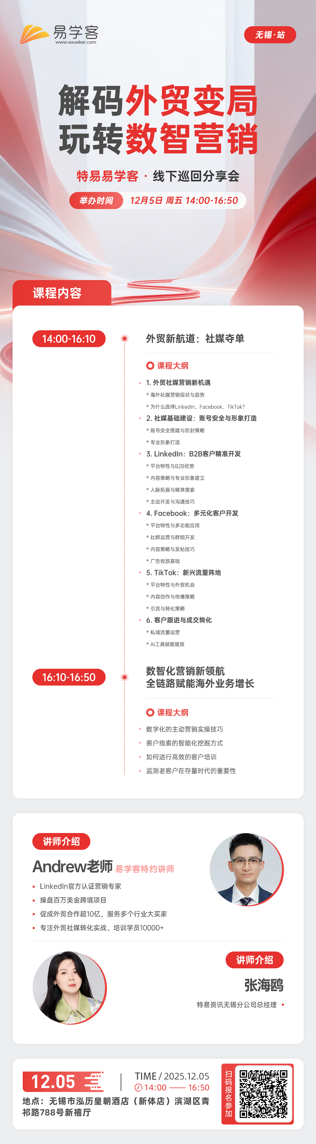 | 【线下培训】外贸新航道:社媒夺单(无锡) | |||