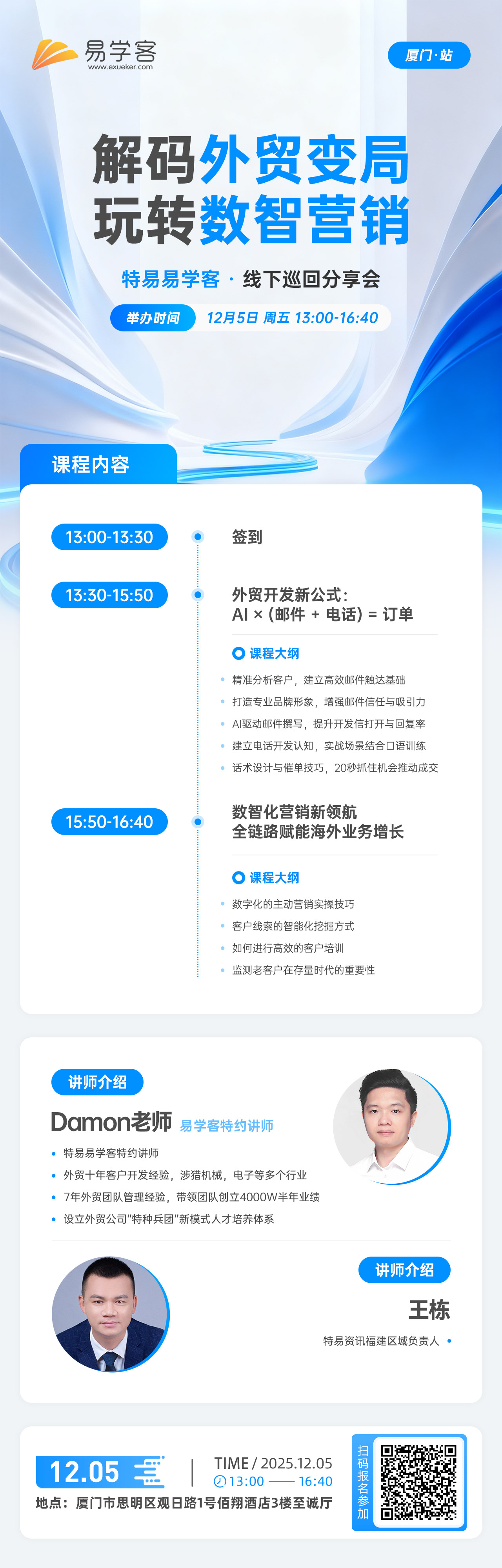 | 【线下培训】外贸开发新公式:AI × (邮件 + 电话) = 订单 (厦门) | |||